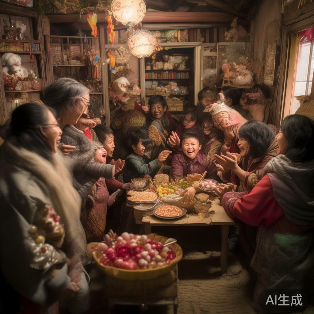 渐渐地,有热闹的讨论声,小屋子里坐满了人,一个个要求分享糖果,沐浴祝福,院子里啪啪作响,惹得何玉章哭笑不得。邻里大妈紧紧抱住小何珍,二狗旦驱散众人之后,叮嘱大家第二天再来共享喜宴,旋即关上房门。