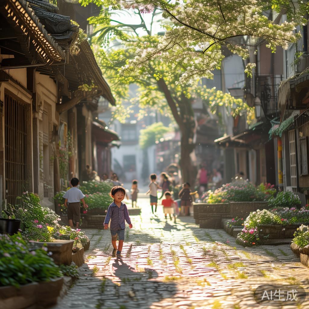 在一个温暖的夏日午后,小镇的街道上漂浮着花香,阳光透过梧桐树的枝叶洒落在地面,形成斑驳的光影。孩子们欢快地奔跑于广场,仿佛时间在这一刻静止。这样的场景让人不禁思考:在现代社会中,这样简单而纯真的时刻究竟有多珍贵?背景中的小镇承载了多少人们未曾诉说的故事?