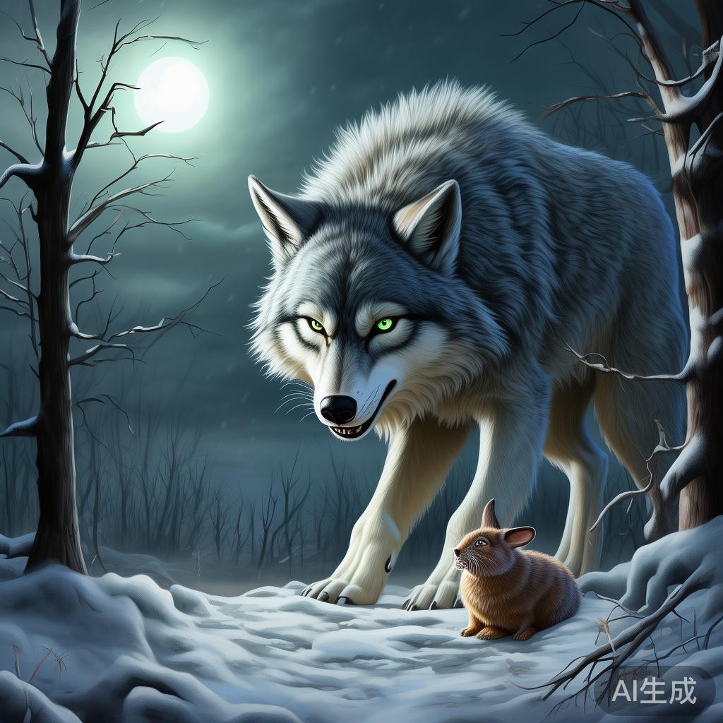 一天,大雪纷飞,狼没有出去狩猎,小羊却饿得受不了,决定自己出去寻找一些干草和树叶。狼堵住洞口说:“你看看外面的严寒,下哪去找食物,不如在家忍耐一下吧!”