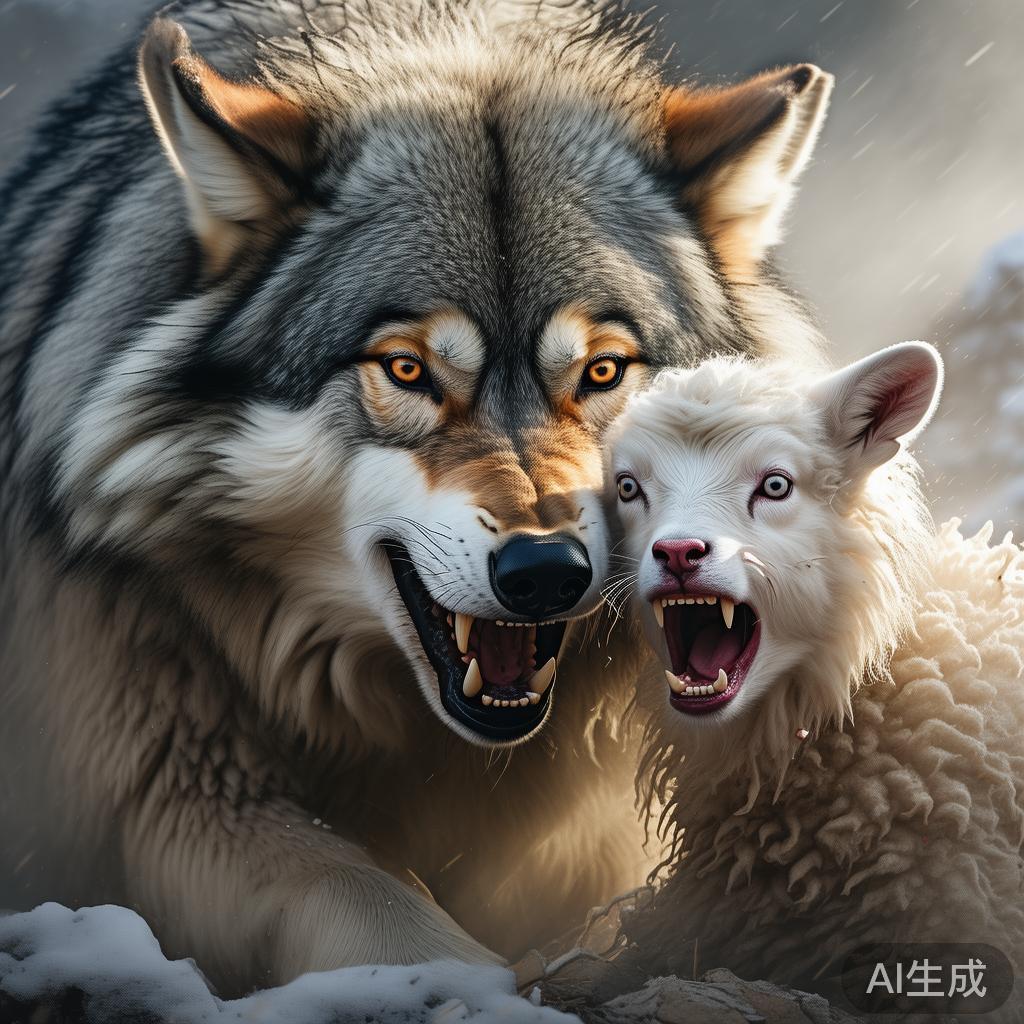 说完,狼脸色一沉,露出凶恶的表情,扑了上去,咬住小羊的喉咙。小羊拼命挣扎,泪水迸现,最终无力抵抗,死去了。